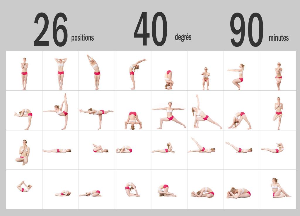 Позы были выбраны Чоудхури из классических поз хатха и предназначены для «систематического перемещения свежей, насыщенной кислородом крови к 100 процентам вашего тела, к каждому органу и волокну», согласно официальному сайту бикрам-йоги. Позы, в том числе поза треугольника, поза дерева, поза орла и поза кобры, среди других распространенных поз хатха-йоги, должны выполняться в определенном, неизменном порядке, чтобы достичь желаемых результатов.