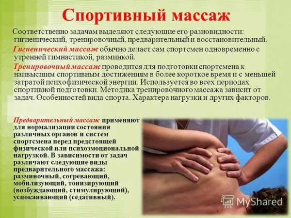 Π‘ΠΏΠΎΡΡΠΈΠ²Π½ΡΠΉ ΠΌΠ°ΡΡΠ°ΠΆ ΠΏΡΠΈΠΌΠ΅Π½ΡΠ΅ΡΡΡ Π΄Π»Ρ Π±ΡΡΡΡΠΎΠ³ΠΎ Π²ΠΎΡΡΡΠ°Π½ΠΎΠ²Π»Π΅Π½ΠΈΡΠΌ ΠΏΠΎΡΠ»Π΅ ΡΠΈΠ·ΠΈΡΠ΅ΡΠΊΠΈΡ Π½Π°Π³ΡΡΠ·ΠΎΠΊ ΠΈ ΡΠ²Π»ΡΠ΅ΡΡΡ ΠΏΡΠ΅ΠΊΡΠ°ΡΠ½ΡΠΌ ΡΡΠ΅Π΄ΡΡΠ²ΠΎΠΌ ΠΏΠΎΠ΄Π³ΠΎΡΠΎΠ²ΠΊΠΈ ΠΎΡΠ³Π°Π½ΠΈΠ·ΠΌΠ° ΠΊ ΡΡΠ΅Π½ΠΈΡΠΎΠ²ΠΊΠ°ΠΌ ΠΈ ΡΠΎΡΠ΅Π²Π½ΠΎΠ²Π°Π½ΠΈΡΠΌ. Π Π°Π·Π»ΠΈΡΠ°ΡΡ ΡΡΠ΅Π½ΠΈΡΠΎΠ²ΠΎΡΠ½ΡΠΉ, ΠΏΡΠ΅Π΄ΡΡΠ°ΡΡΠΎΠ²ΡΠΉ ΠΈ Π²ΠΎΡΡΡΠ°Π½ΠΎΠ²ΠΈΡΠ΅Π»ΡΠ½ΡΠΉ. ΠΡΠ½ΠΎΠ²Π½ΠΎΠ΅ Π²Π½ΠΈΠΌΠ°Π½ΠΈΠ΅ ΡΠ΄Π΅Π»ΡΠ΅ΡΡΡ ΠΌΡΡΡΠ°ΠΌ, ΡΡΡΡΠ°Π²Π°ΠΌ ΠΈ ΡΡΡ ΠΎΠΆΠΈΠ»ΠΈΡΠΌ. ΠΠ½ ΡΠΏΠΎΡΠΎΠ±ΡΡΠ²ΡΠ΅Ρ ΠΏΡΠΎΡΠ΅ΡΡΠ°ΠΌ Π·Π°ΠΆΠΈΠ²Π»Π΅Π½ΠΈΡ ΠΌΠΈΠΊΡΠΎΡΡΠ°Π²ΠΌ, ΡΡΠΈΠΌΡΠ»ΠΈΡΡΠ΅Ρ ΠΊΡΠΎΠ²ΠΎΠΎΠ±ΡΠ°ΡΠ΅Π½ΠΈΠ΅, ΡΡΠΊΠΎΡΡΡ, ΡΠ°ΠΊΠΈΠΌ ΠΎΠ±ΡΠ°Π·ΠΎΠΌ, Π²ΡΠ²ΠΎΠ΄ ΡΠΎΠΊΡΠΈΠ½ΠΎΠ² ΠΈ ΠΌΠΎΠ»ΠΎΡΠ½ΠΎΠΉ ΠΊΠΈΡΠ»ΠΎΡΡ, Π½Π°ΠΊΠΎΠΏΠΈΠ²ΡΠΈΡ ΡΡ Π² Π½Π°ΠΏΡΡΠΆΠ΅Π½Π½ΡΡ ΠΌΡΡΡΠ°Ρ . ΠΡ ΠΊΠ»Π°ΡΡΠΈΡΠ΅ΡΠΊΠΎΠ³ΠΎ ΡΠΏΠΎΡΡΠΈΠ²Π½ΡΠΉ ΠΎΡΠ»ΠΈΡΠ°Π΅ΡΡΡ ΡΠΈΠ»ΠΎΠΉ ΠΈ ΠΈΠ½ΡΠ΅Π½ΡΠΈΠ²Π½ΠΎΡΡΡΡ Π²ΠΎΠ·Π΄Π΅ΠΉΡΡΠ²ΠΈΡ ΠΈ Π²ΠΊΠ»ΡΡΠ°Π΅Ρ Π΄ΠΎΠΏΠΎΠ»Π½ΠΈΡΠ΅Π»ΡΠ½ΡΠ΅ ΠΌΠ°ΡΡΠ°ΠΆΠ½ΡΠ΅ ΠΏΡΠΈΠ΅ΠΌΡ Π΄Π»Ρ ΡΡΡΡΠ°Π²ΠΎΠ² ΠΈ ΠΌΡΡΡ.
