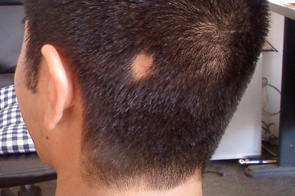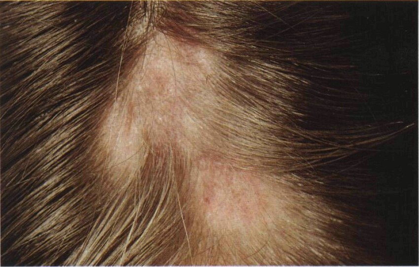 При локализации процесса на волосистой части головы образуются многочисленные, беспорядочные плешинки величиной от горошины до ногтя, покрытые серовато-белыми чешуйками. Больные волосы имеют чрезвычайно характерные изменения: большинство из них не выпали, а только укорочены и обломаны.