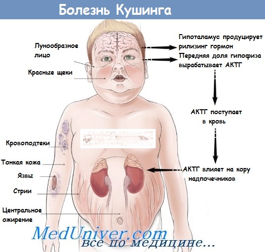 Болезнь Кушинга возникает, когда доброкачественная (доброкачественная) опухоль, называемая аденомой, формируется в гипофизе, вызывая чрезмерное высвобождение АКТГ и, как следствие, повышенное производство кортизола.Длительное воздействие повышенного уровня кортизола приводит к появлению признаков и симптомов болезни Кушинга: изменение количества и распределения жира в организме, уменьшение мышечной массы, ведущее к слабости и снижению выносливости, истончение кожи, вызывающее растяжки и легкие синяки, как следствие, истончение костей. при остеопорозе — повышенное кровяное давление, нарушение регуляции уровня сахара в крови, ведущее к диабету, ослабленная иммунная система, неврологические проблемы, нерегулярные менструации у женщин и замедление роста у детей.Гиперактивные надпочечники, вырабатывающие кортизол, также могут вырабатывать повышенное количество мужских половых гормонов (андрогенов), что приводит к гирсутизму у женщин. Влияние избытка андрогенов на мужчин неясно.
