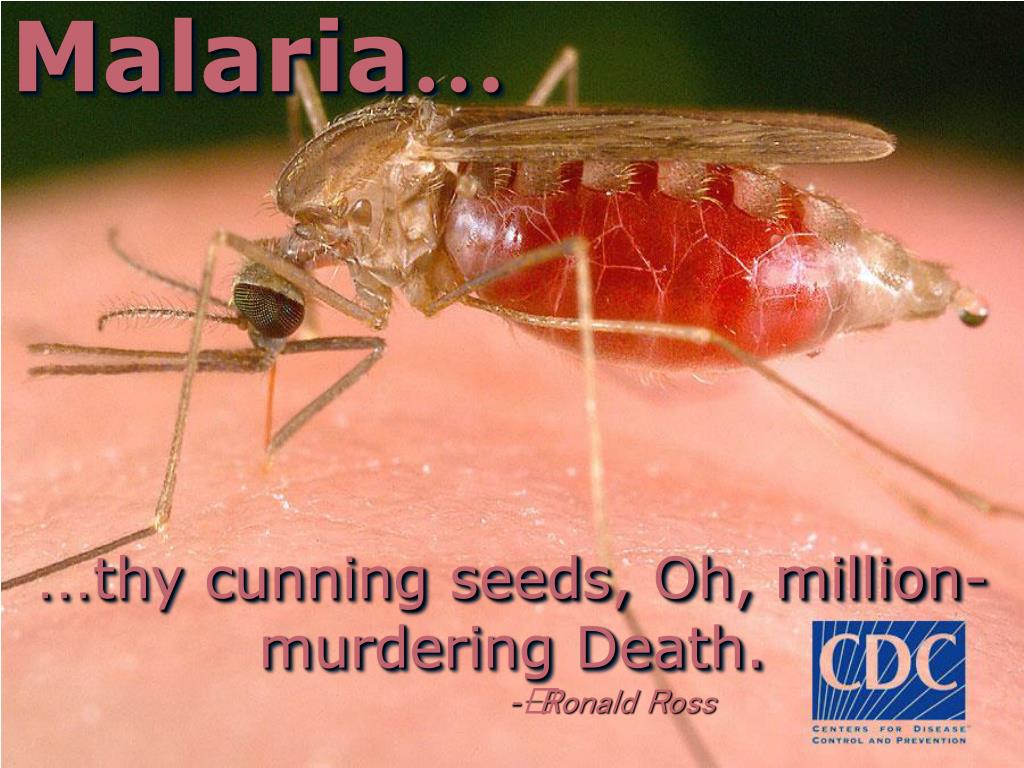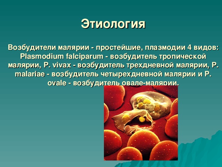 В переводе с итальянского языка «малярия» означает «плохой воздух». Это заболевание собой представляет группу инфекционных болезней, которые могут передаться человеку при укусе комара вида Anopheles. Малярия сопровождается сильным ознобом и лихорадкой, спленомегалией (увеличением селезенки), увеличением печени. Ежегодно малярией заражаются 400-500 миллионов человек, и около 3 миллионов погибает. Основным возбудителем малярии являются плазмодии – простейшее. Для людей патогенными являются всего четыре вида, а именно, P. malariae и P. vivax, P. ovale и P. falciparum. Было установлено, что заражение проходит во время впрыскивания или же, инокуляции самкой комара (малярийного) спорозоитов в кровь или лимфосистему, что происходит в процессе кровососания.