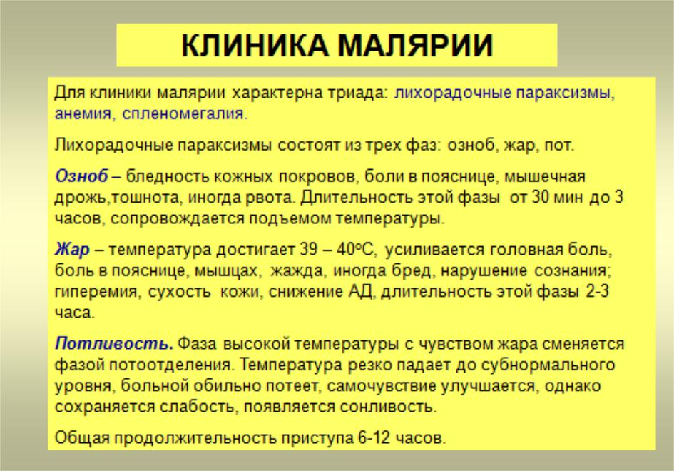 Средний инкубационный период от укуса комара до начала заболевания составляет 2 недели и более.Симптомы малярии будут варьируются в зависимости от того, какой вид Plasmodium является вовлеченный. Классические симптомы малярии включают возникновение циклических пароксизмов на эритроцитарной стадии Plasmodium жизненный цикл. Циклические пароксизмы — это периодические приступы озноба. и лихорадка (от 40 ° C до 42 ° C). Эти симптомы вызваны внезапным выбросом мерозоитов Plasmodium , токсинов, и остатки эритроцитов в кровоток.Прочие симптомы малярии может включать обильное потоотделение, обезвоживание, диарею (без крови) и рвота, головная боль, мышечные боли, анорексия, желтуха, истощение, увеличение печени (гепатомегалия), увеличение селезенки (спленомегалия) и анемия.
