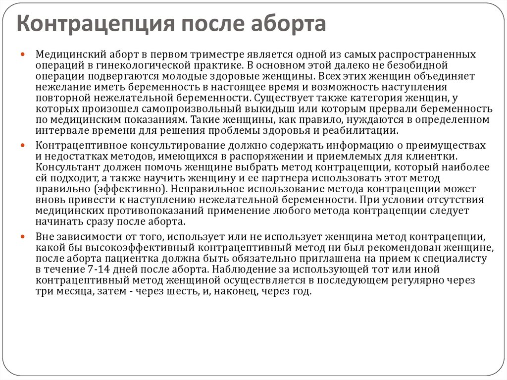 Вы можете забеременеть сразу после аборта, поэтому рекомендуется как можно скорее поговорить с медсестрой или врачом о контроле над рождаемостью — они могут помочь вам найти метод, который подходит именно вам.Вы можете начать использовать противозачаточные средства сразу после аборта.