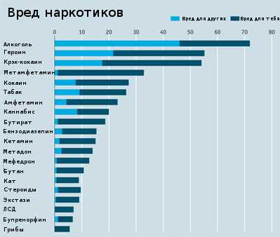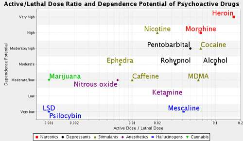 Обрати внимание на картиночку. Вещества слева внизу самые безопасные, а те, что выше и правее, более опасны. Заметь: этот естественный друг, марихуана, гораздо опаснее ЛСД, синтезируемого в лабораториях, и зависимость от нее сильнее. И да, посмотри на алкоголь, затесавшийся в компанию кокаина и морфина. Как тебе такое?