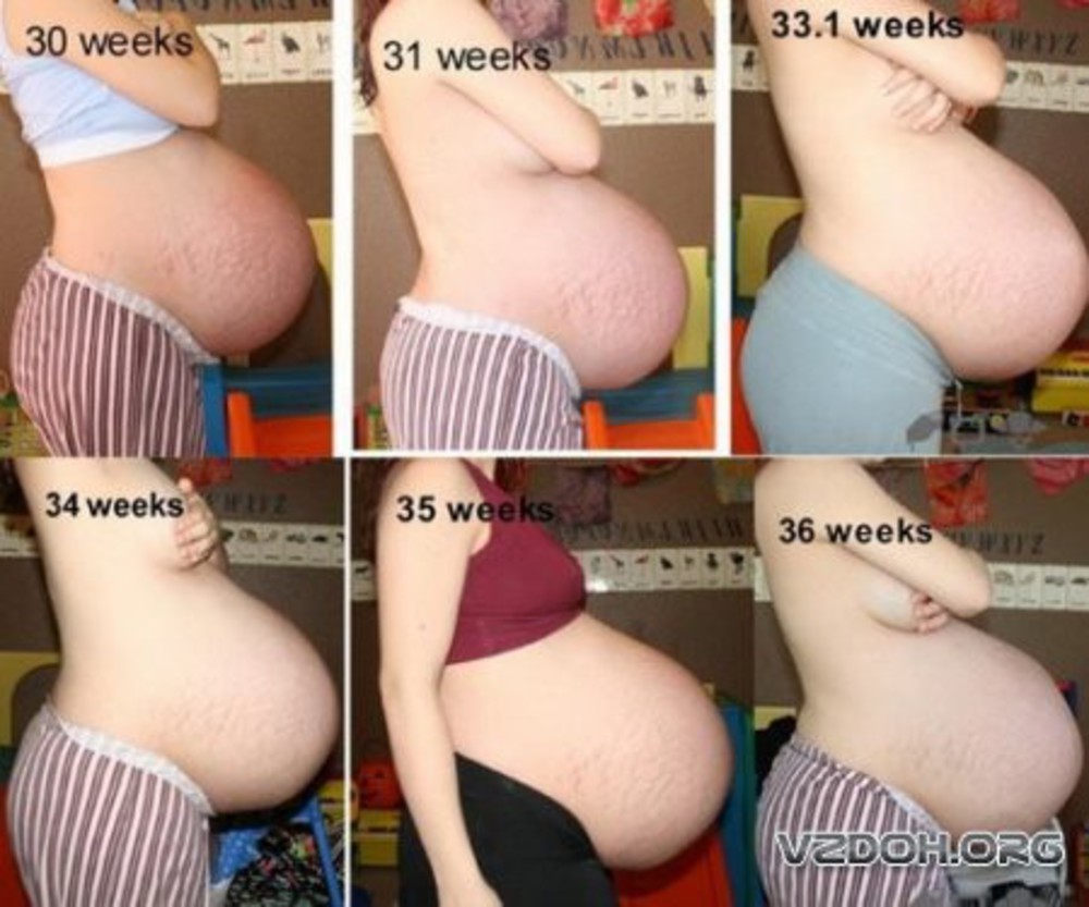 Твоя матка сейчас прямо под ребрами. Прибавка в весе замедлится в последние несколько недель беременности, предшествующих родам. Кожа живота растянута до предела, по крайней мере, так кажется.