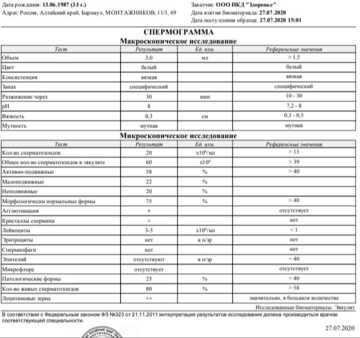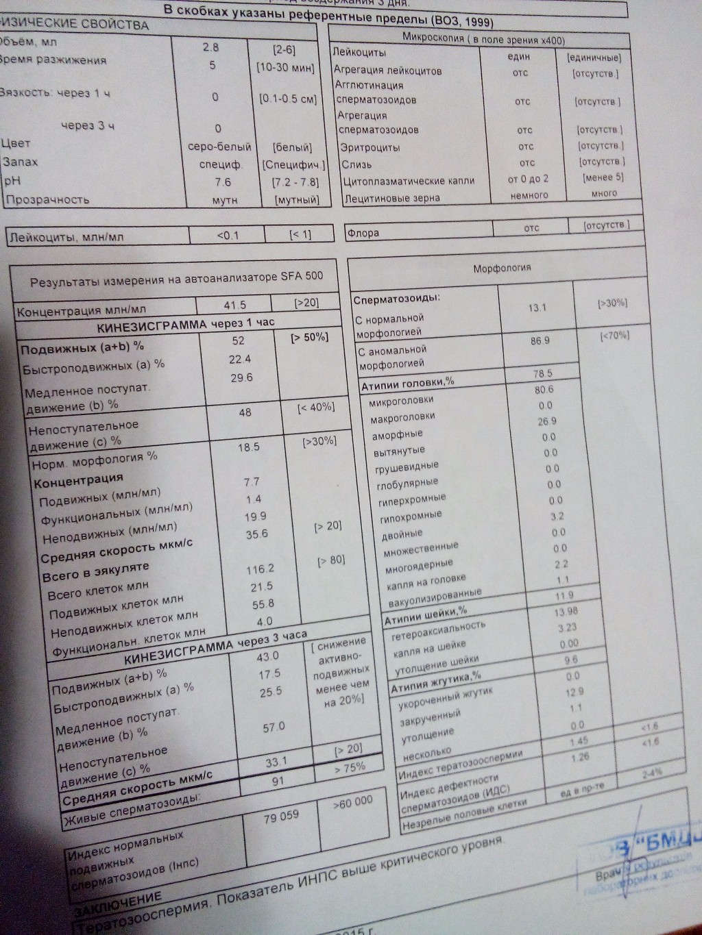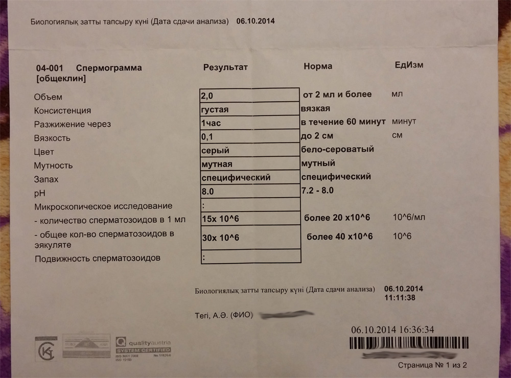 Также фиксируются макроскопические параметры спермы: ее объем, цвет, вязкость и время разжижения, рН.