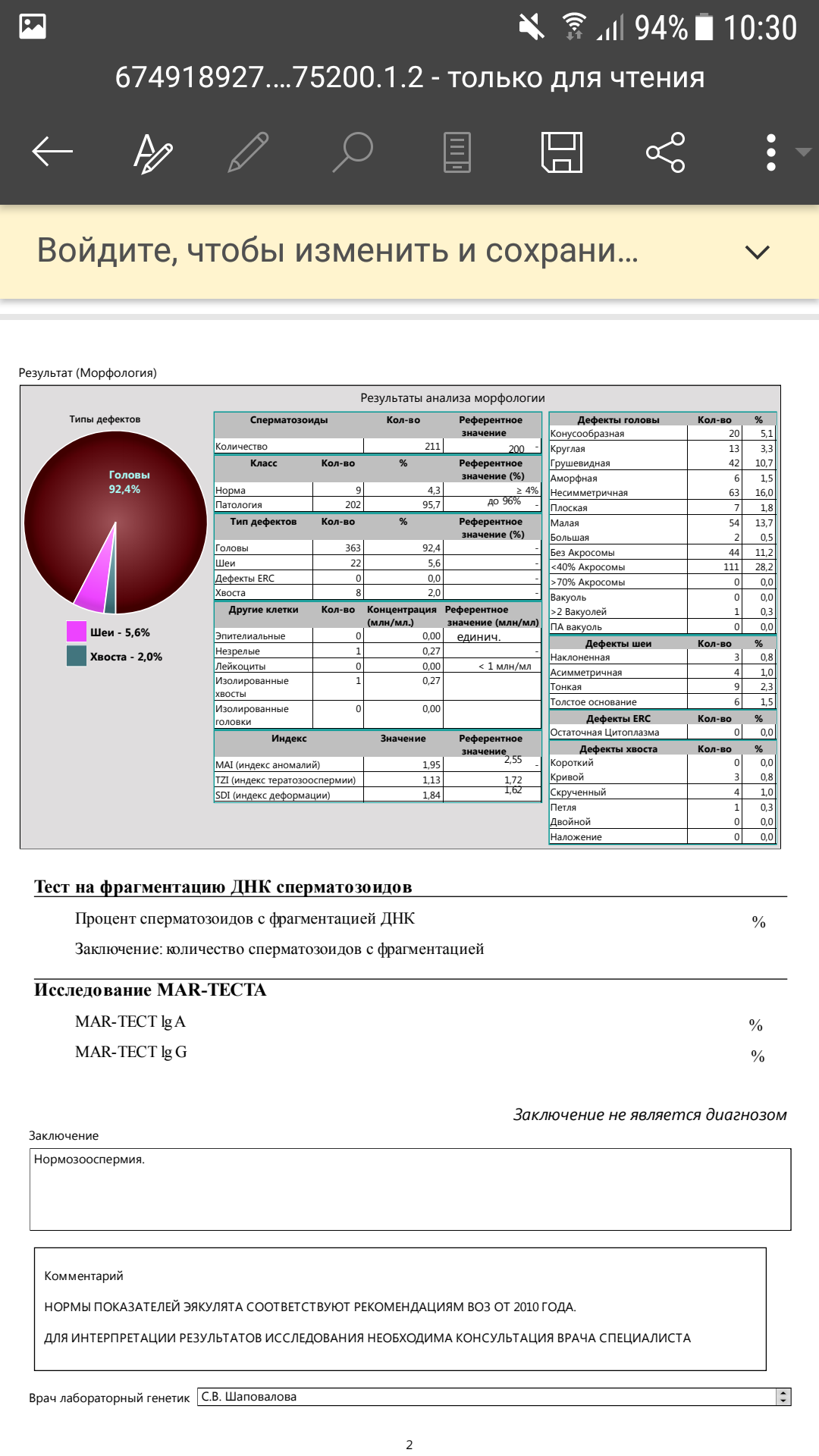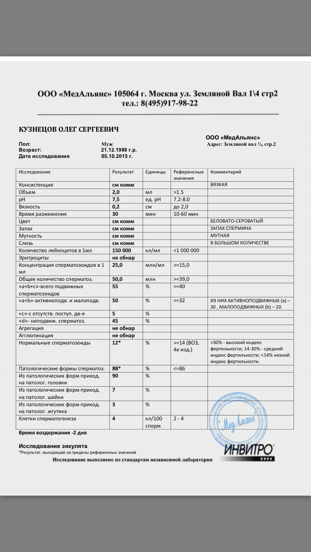 На самом деле анализ спермы — всего лишь проверка мужской фертильности, то есть способности к оплодотворению. От бесплодия еще никто не умирал, и как говорил один мой знакомый венеролог: «Это лечится!» Конечно, при своевременной диагностике и выявлении основной причины — например, инфекции или гормональных нарушений.