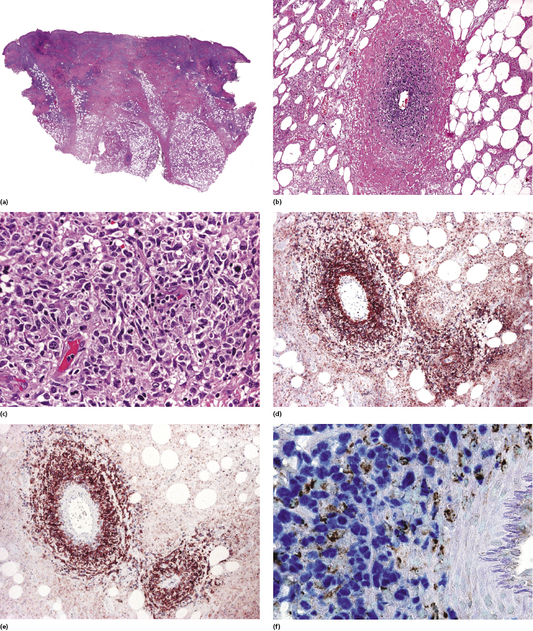 Комментарии: Наиболее часто встречающимся морфологическим признаком синдрома Сезари является поверхностный периваскулярный или полосовидный инфильтрат из крупных лимфоцитов, которые могут проявлять признаки атипии (крупные, гиперхромные или конволютивные ядра) [12, 13]. Может присутствовать эпидермотропизм [13, 14]. Тем не менее, при синдроме Сезари гистологические признаки, позволяющие установить диагноз, часто отсутствуют. Гистологические признаки синдрома Сезари отсутствовали в 39% образцов, полученных от 41 пациента [13].