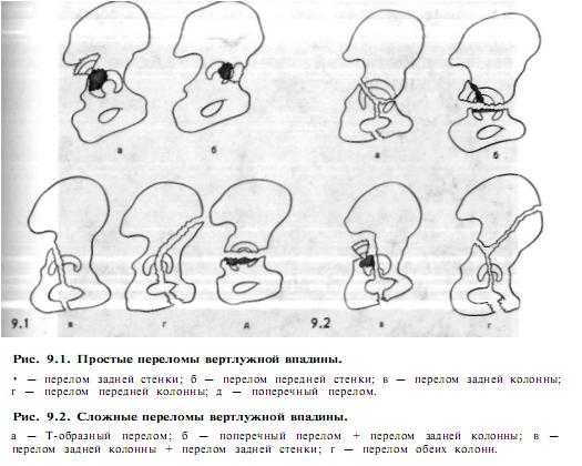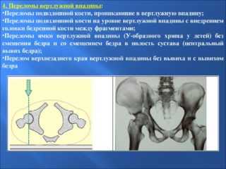 Выделяют переломы верхнего, верхне-заднего или заднего края вертлужной впадины с подвывихом или вывихом головки бедренной кости.