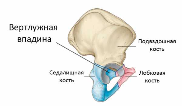 Вертлужная впадина находится на стыке трех основных костей таза – подвздошной, лобковой, седалищной.