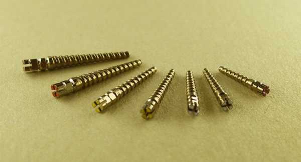 - Парапульпарные стержни выполняются из металлического сплава, а снаружи покрываются полимером. Применяются преимущественно для армирования пломбировочного материала с полостью зуба. Их вставляют в твердые ткани без проникновения в пульпу. С одной стороны, это исключает возможность проникновения внутрь бактерий и развития воспалений, с другой, ограничивает спектр применения.