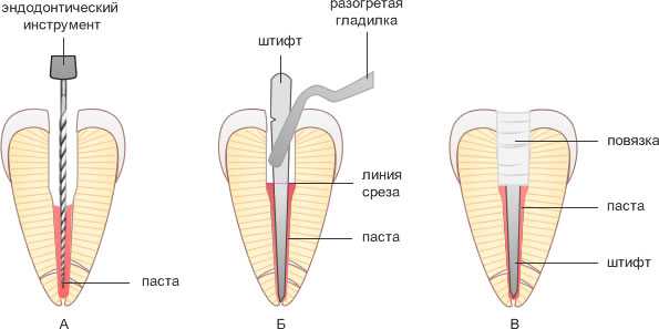 расширение канала и введение гуттаперчи перед установкой штифта в зуб;