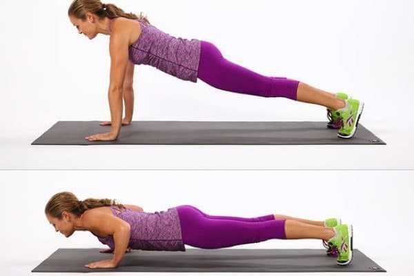 Для выполнения отжиманий нужно лечь на пол лицом вниз. Руки важно располагать правильно – чуть шире линии плеч. Держа спину прямо без прогиба в области поясницы, ритмично сгибать и выпрямлять руки в локтях.