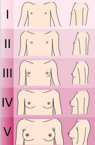 Главным, а в большинстве случаев и первым, признаком роста груди, являются неприятные болевые ощущения в области груди. Иногда для того чтобы узнать, что грудь растет, необходимо провести осмотр. При ощупывании ощутимы незаметные увеличения в области сосков. Некоторые девочки сильно пугаются начала таких преображений. В таких случаях с ребенком нужно поговорить и объяснить, что она начинает превращаться в женщину, и в этом нет ничего плохого. Родители должны понимать, что эти изменения только начало. В большинстве случаев признаки роста груди проявляются на протяжении нескольких годов. Половые изменения в организме девочки характеризуются четырьмя стадиями.