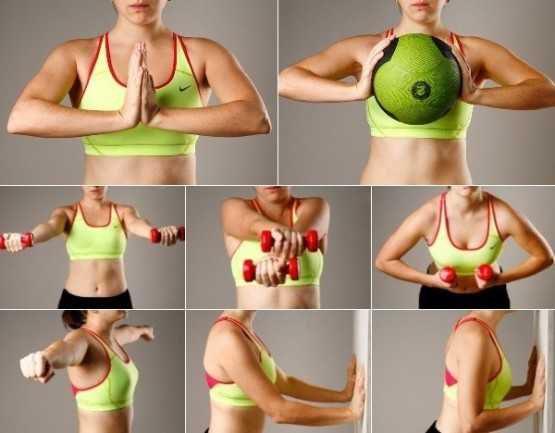 Физические упражнения для увеличения грудиТе, кто однажды осознает, что поедание сырого теста, специй, рисование йодной сетки и прочие ухищрения не работают, решают отправиться в зал, где тренер любезно советует заниматься с гантелями, наращивая грудные мышцы. Этот вариант действительно позволит подтянуть грудь, но никак не увеличить, а в некоторых случаях даже наоборот – ведь молочные железы также состоят и из жировой ткани, следовательно, интенсивные физические упражнения сожгут жир, и уменьшат грудь.